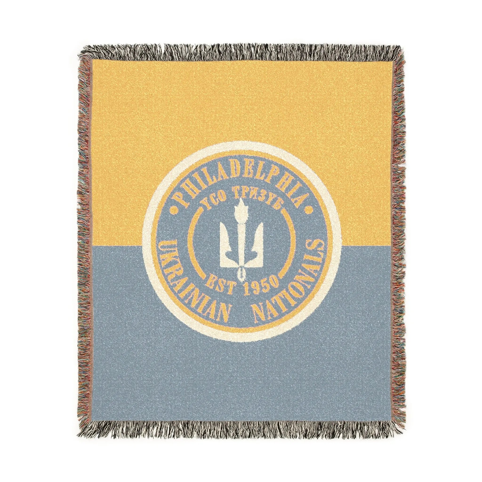 No need to sit on the grass! This woven picnic blanket is perfect for game days. Show your Ukie pride as you watch your star from the sidelines. It features the traditional Philadelphia Ukrainian Nationals logo in a cool color split style. The blanket has optimal balance in weight. Lightweight for carrying and easy to store away. It features fringe trim detailing and the fabric is well-crafted.